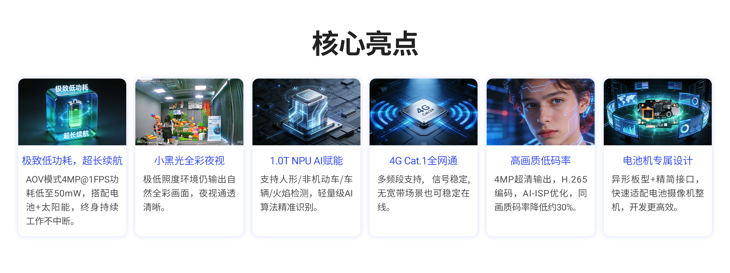 | AI-ISP、AI-NR降噪、人形/车辆/非机动车/火焰检测 | 小黑光全彩、IR-CUT自动切换、红外+白光补光 | AOV智能唤醒,待机功耗极低,太阳能长续航 | Cat.1全网通,多频段兼容,户外覆盖强 | |||||