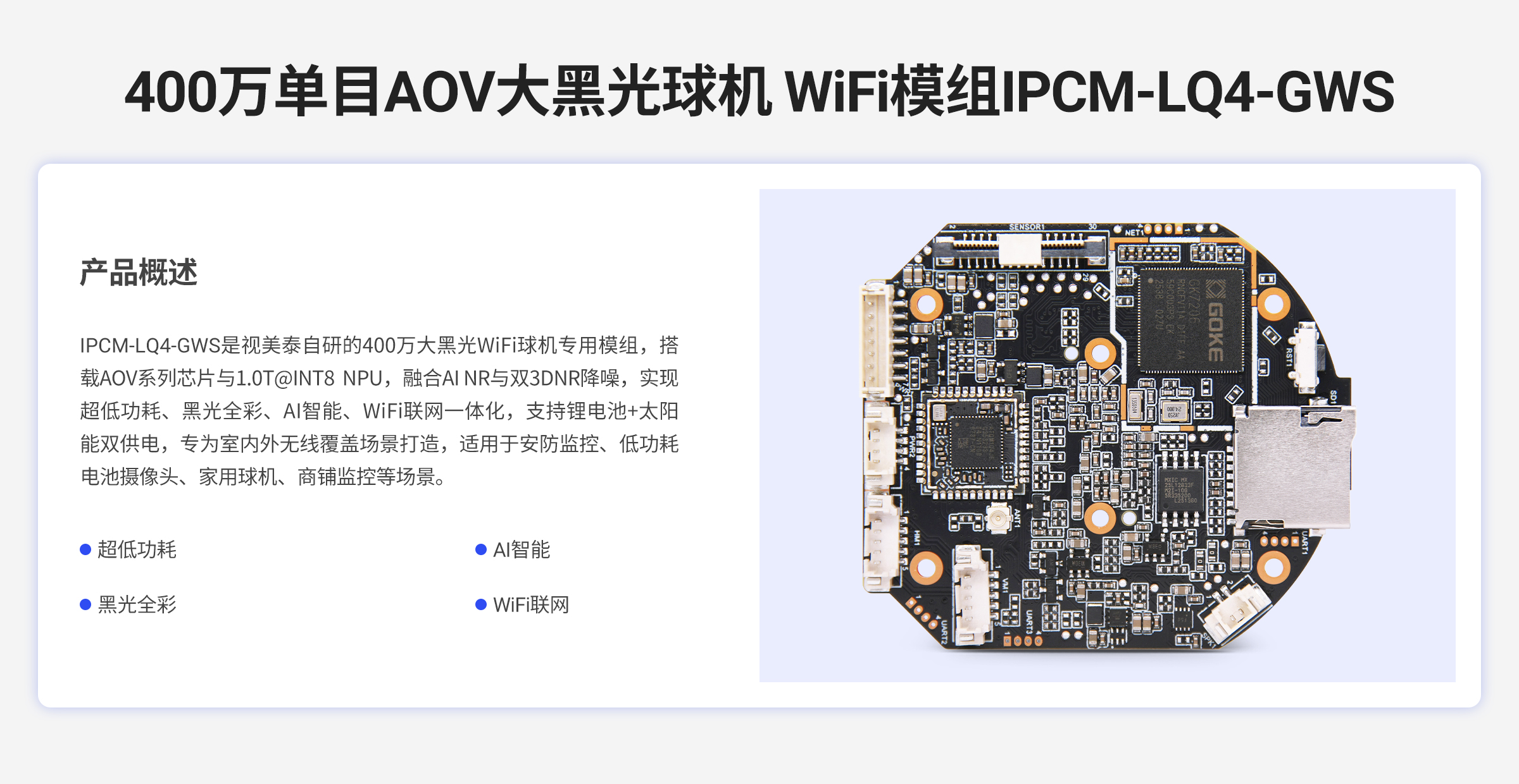 | AI-ISP、AI-NR降噪、人形/车辆/非机动车/火焰检测 | 小黑光全彩、IR-CUT自动切换、红外+白光补光 | AOV智能唤醒,待机功耗极低,太阳能长续航 | 2.4G WiFi稳定传输,蓝牙快速配网 | |||||